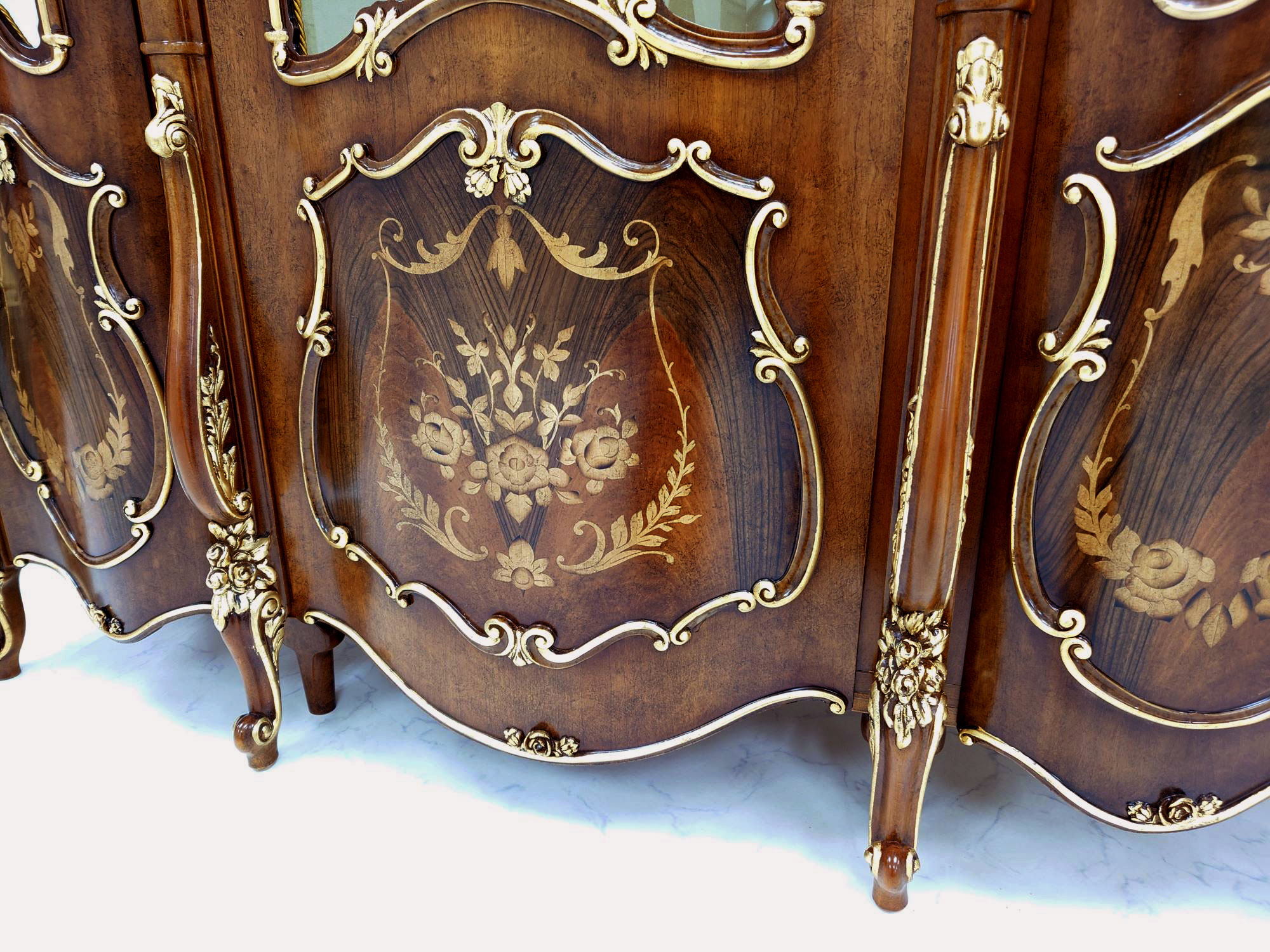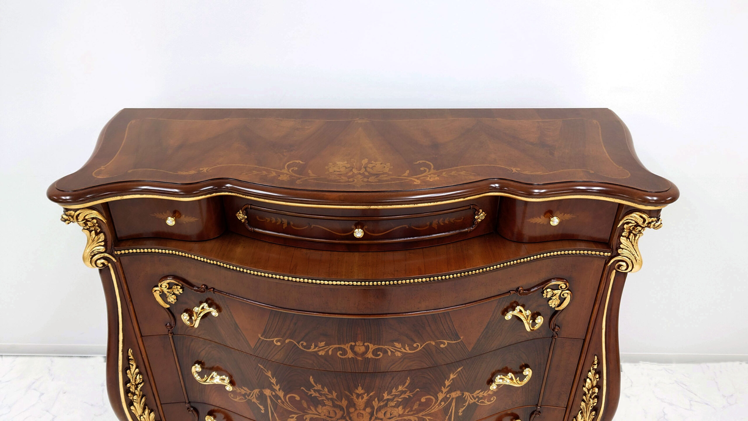 繊細かつ華やかな象嵌細工と金箔で彩られたこれらの家具は、長年にわたり培われ受け継がれてきたイタリア家具の伝統と技術が詰まった、まさに至極の一品です。