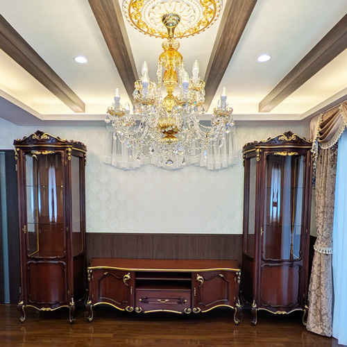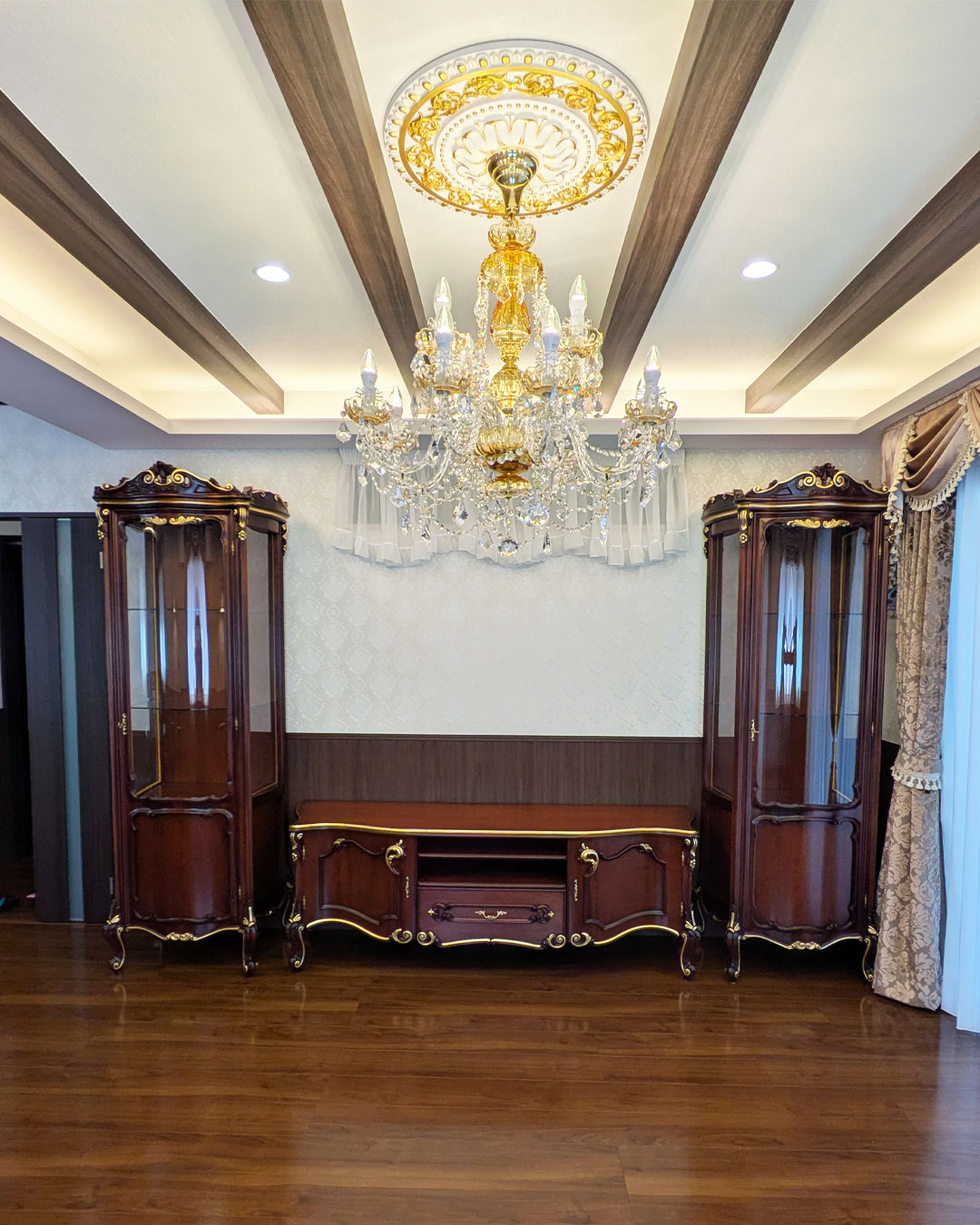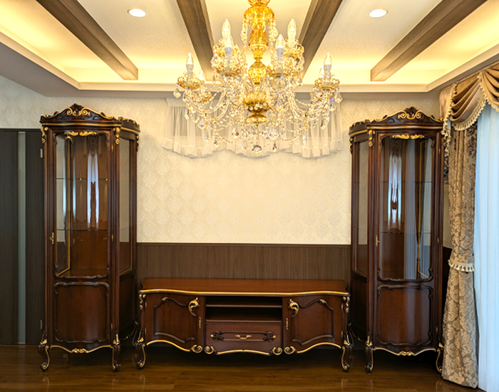 シンメトリーに配されたTVボードとキャビネットは、優雅な曲線と深いブラウンにゴールドをあしらったクラシック家具の王道スタイル。