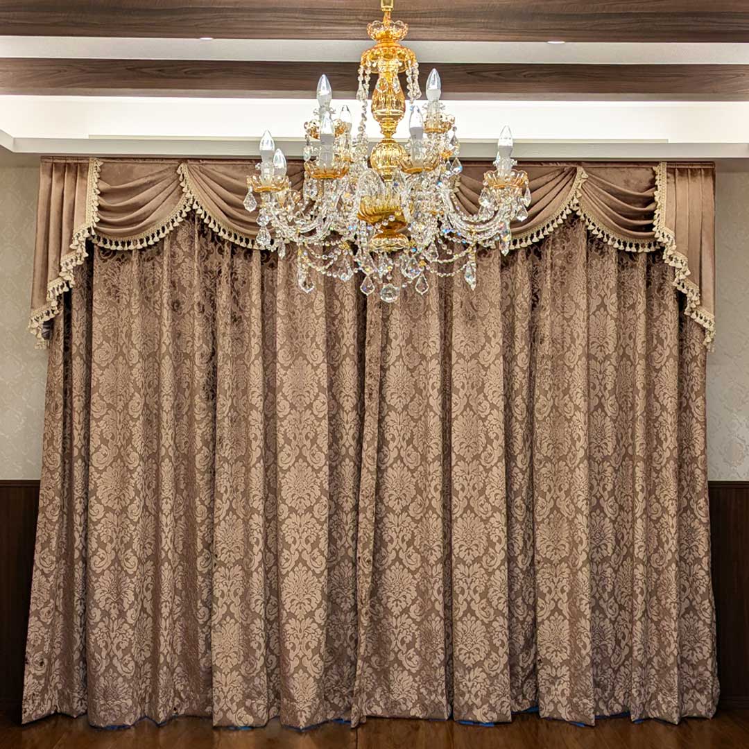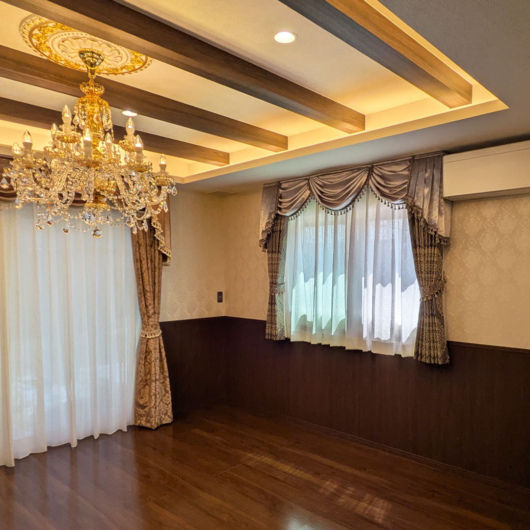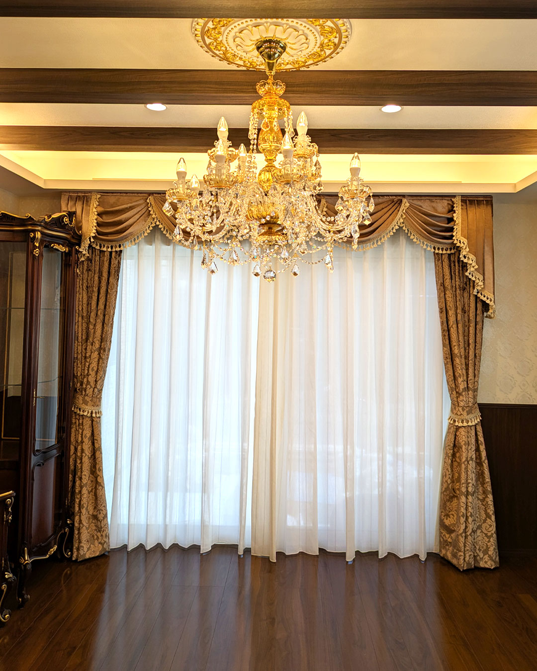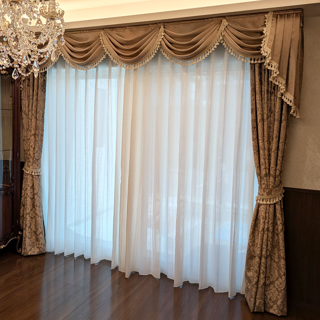 リビングの掃き出し窓を飾るのは、イタリアから取り寄せたダマスク柄のベルベットをふんだんに用いたドレーブカーテン。スワッグ&テールを施した重厚でエレガントなデザインは、お部屋の印象をより一層引き立てます。