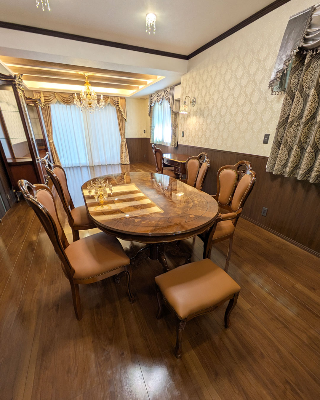 象嵌細工を施した光沢のあるダイニングテーブルと、本革のダイニングチェアは、日常の食卓を上質な“ハレの空間”へと導いてくれます。