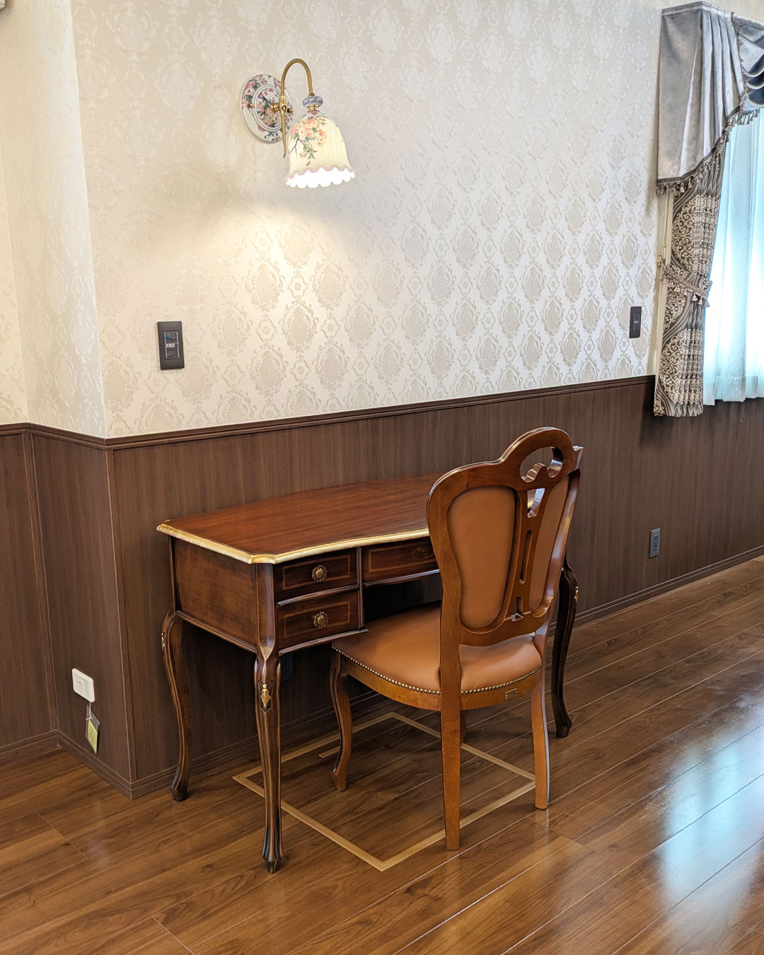 リビングダイニングの一角に置かれた猫脚のデスク。細部まで意匠を揃えるこだわりを感じさせます。